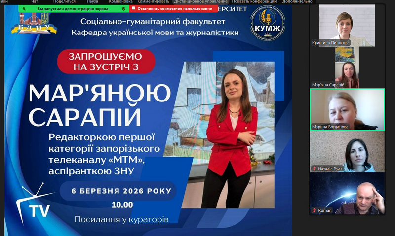 A practice-oriented meeting was held recently for higher education students majoring in Journalism, which opened up new facets of their future profession. The guest of the event was an experienced media professional, editor of the 1st category of the MTM TV channel, and a postgraduate student of Zaporizhia National University, Mariana Sarapii.