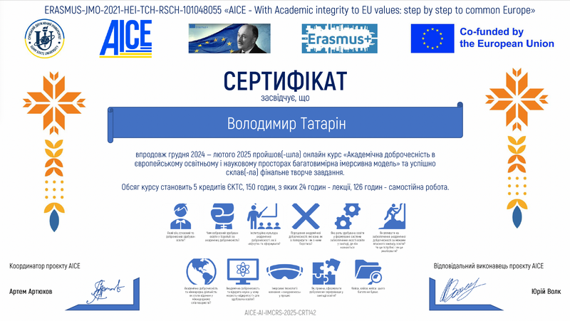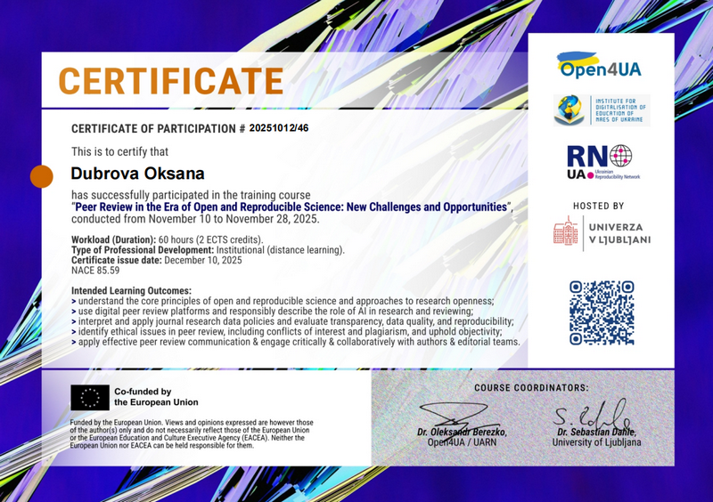 A priority direction of the department’s activities also remains constructive collaboration with national scientific hubs and research networks. Oksana Dubrova and Volodymyr Tatarin are integrating into the activities of the Ukrainian Reproducibility Network – an initiative aimed at enhancing the methodological quality and verifiability of scientific research. Additionally, Volodymyr Tatarin is systematically expanding his competence profile in areas of critical importance, including ensuring academic integrity, coordinating interinstitutional educational projects, and implementing advanced digital technologies, particularly artificial intelligence tools, in the educational process. His internships encompass both national scientific and educational platforms (ALICE and MOTIVEFHUA projects) and international structures (the “Digital Development Academy”), reflecting a comprehensive approach to mastering contemporary pedagogical practices. Artem Poluliakhov is undergoing an internship at the International Institute of Technologies, which demonstrates the active implementation of the technological component in foreign language teaching methodology.