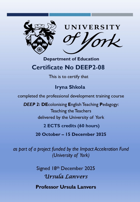 The spectrum of professional development areas for lecturers is characterized by considerable diversification. A significant portion of the department’s staff undertakes internships at leading European research universities. Thus, Violetta Panchenko, Dmytro Poberezhnyi, Iryna Shkola, and other lecturers have chosen the University of York (UK) and the University of Helsinki for professional development – academic institutions with recognized reputations in the field of language didactics and foreign language teaching methodology. This cooperation strategy confirms the department’s clear focus on implementing international standards of educational service quality.