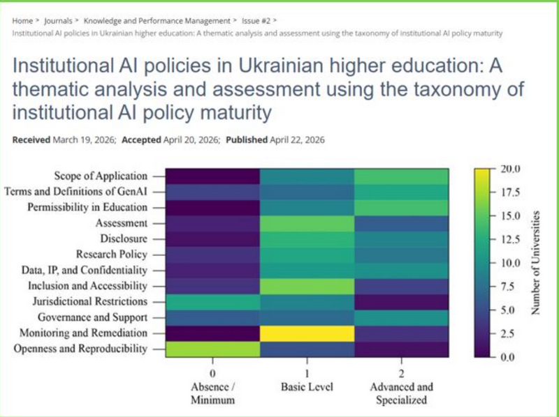 This issue was investigated by the authors of the article “Institutional AI policies in Ukrainian higher education: A thematic analysis and assessment using the taxonomy of institutional AI policy maturity” on the pages of the Business Perspectives publication.