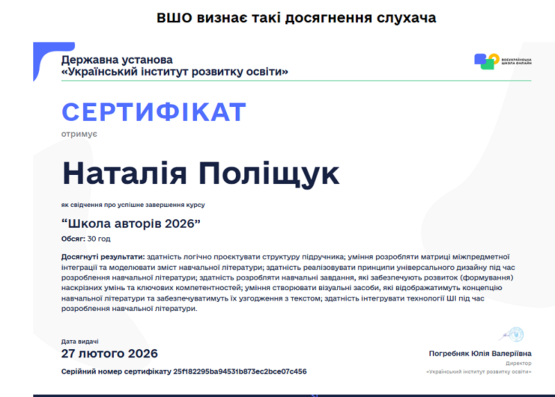 Natalia Polishchuk, a lecturer at the Department of Physical Culture, Sports and Teaching Methods, has successfully completed the training program “School of Authors 2026”, implemented by the Ukrainian Institute for Education Development within the initiative of the All-Ukrainian Online School.