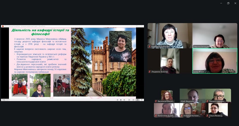 The format of the event combined a visual presentation with musical and video greetings and live interaction. Through photographs and brief commentaries, participants were able to trace the main stages of Maryna Antoshchak’s life and professional career – from her childhood and school years, through her work as a history teacher at Secondary School No. 16 in Berdyansk, to her many years of productive activity at the Department of History and Philosophy of BSPU.