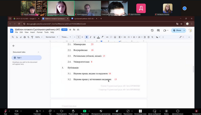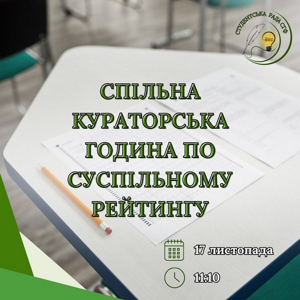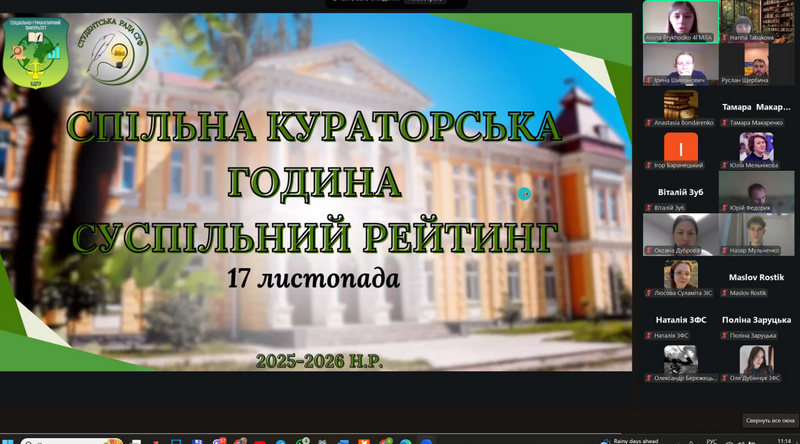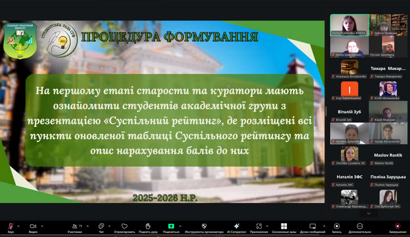 Студентська рада університету розробила форму, яка максимально враховує здобутки у різних сферах кожного студента. З метою роз’яснення кожного етапу заповнення форми суспільного рейтингу студентська рада соціально-гуманітарного факультету на чолі з головою ради, здобувачкою 4 курсу СГФ Альоною Приходько, підготувала і провела спільну кураторську годину. Під час зустрічі куратори та здобувачі отримали можливість побачити, як заповнювати рейтинг, ознайомитися з його складовими і поставити питання. Студентська рада СГФ підготувала презентацію, де детально розписані усі етапи збору й заповнення інформації.