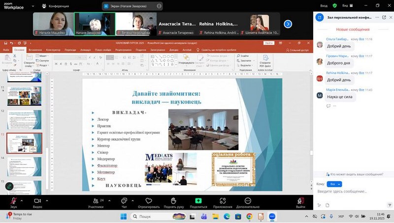 У вступному слові модераторка наголосила: сучасні вимоги до підготовки соціальних педагогів і соціальних працівників зростають, а студентська наукова діяльність стає ключовим інструментом інтеграції навчання, науки і практики. Вона сприяє розвитку аналітичного мислення, креативності, дослідницьких умінь – тих компетентностей, що формують справжнього фахівця.