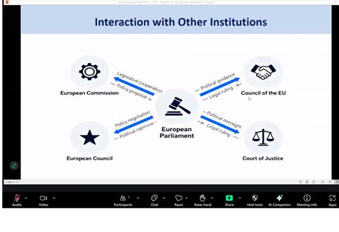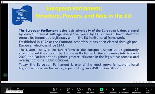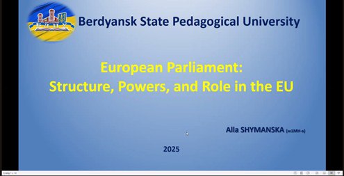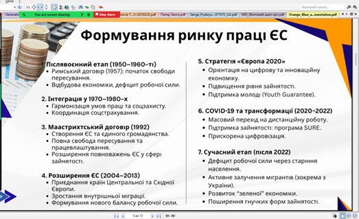 The student presentations helped form a set of essential competences: analytical – the ability to compare management models and EU policies; communicative – public speaking skills in both Ukrainian and English; professional managerial – understanding how European integration processes affect business, the economy, and public administration; critical thinking – evaluating challenges and opportunities related to Ukraine’s integration into the EU.