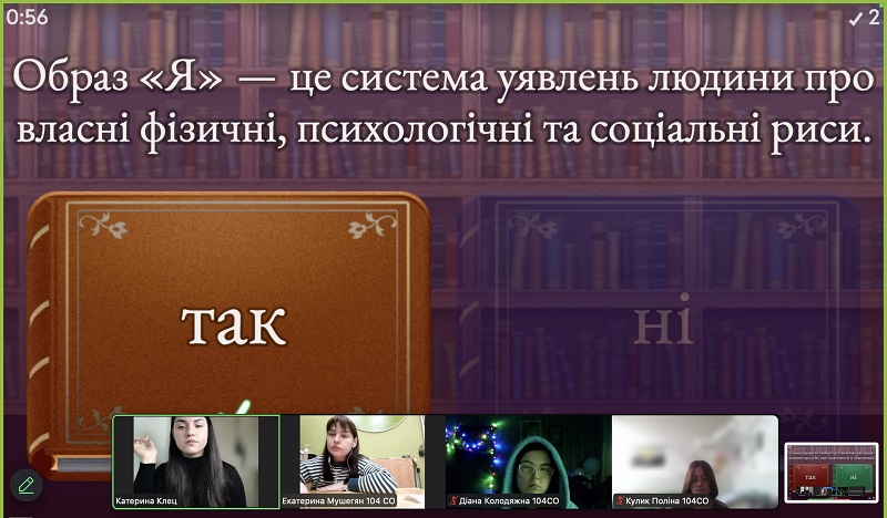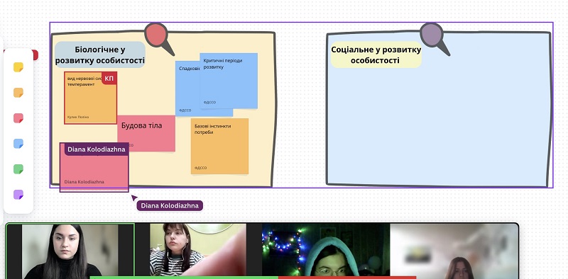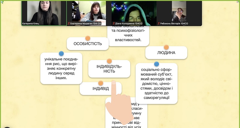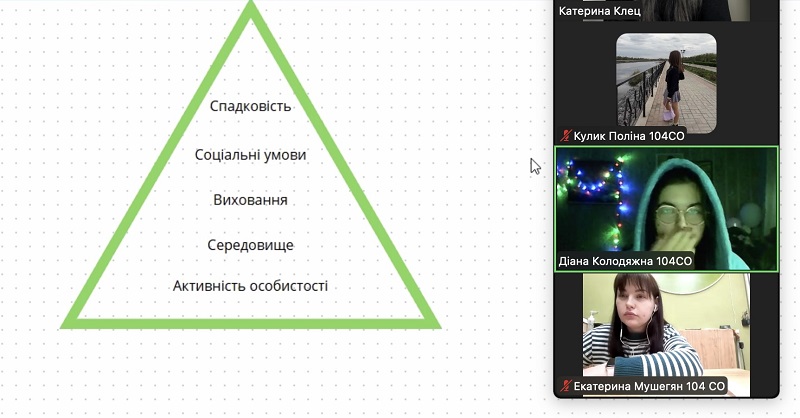Студенти виконували вправи на платформі Wordwall, працювали з інтерактивними дошками, а також розв’язували тематичні кросворди на LearningApps, що зробило навчальний процес динамічним, наочним і практикоорієнтованим. Крім того, під час групової роботи в сесійних залах здобувачі створювали «піраміду факторів розвитку особистості» та аргументували значущість кожного з них.