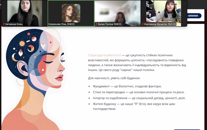 Тема заняття «Психологія особистості» охоплювала ключові питання структури особистості, її розвитку, внутрішніх чинників поведінки, мотивації та самосвідомості. Здобувачі взяли активну участь в аналізі понять «індивід», «індивідуальність», «особистість», визначали роль біологічних і соціальних чинників, досліджували мотиваційні процеси та елементи Я-концепції.