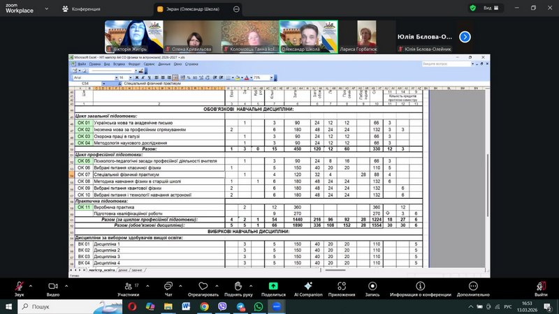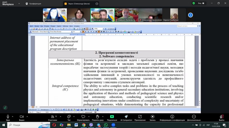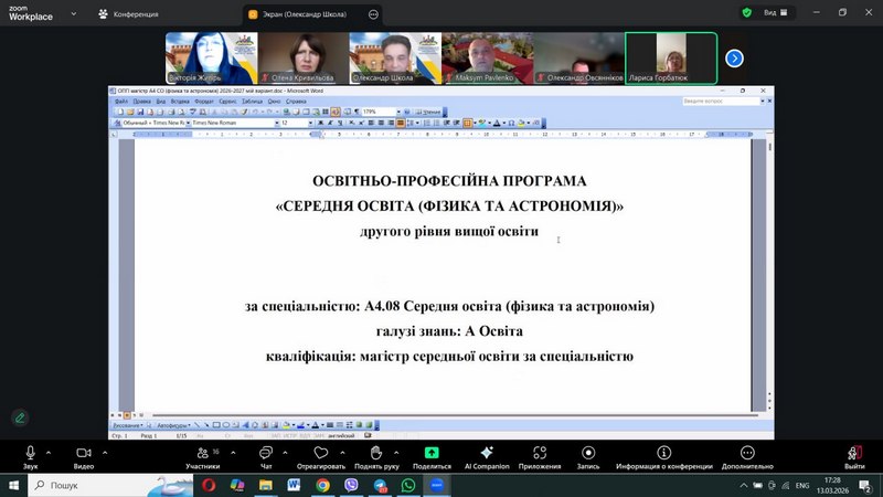 On March 13, 2026, the Faculty Council of the Faculty of Physics, Mathematics, Computer Science and Technology (FMCST) at Berdiansk State Pedagogical University held a meeting to discuss draft educational programs for three levels of higher education for the 2026-2027 academic year. The Head of the Department of Physics, Mathematics and Teaching Methodology, Oleksandr Shkola, familiarized council members and educational program guarantors with the changes introduced following the accreditation of the EP «A4 Secondary Education (Physics and Astronomy)» at the second level of higher education (October 2025), in accordance with the recommendations of the Expert Groups and the Higher Expert Council of NAQA and the outcomes of the working group.