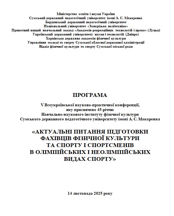 14 листопада 2025 року відбулася V Всеукраїнська науково-практична конференція «Актуальні питання підготовки фахівців фізичної культури та спорту і спортсменів в олімпійських і неолімпійських видах спорту», присвячена 45-річчю Навчально-наукового інституту фізичної культури Сумського державного педагогічного університету імені А.С. Макаренка.