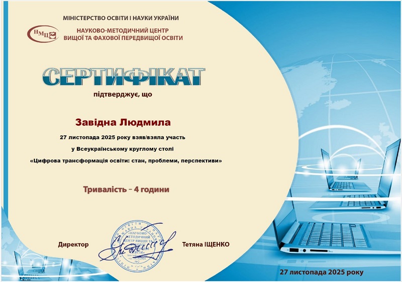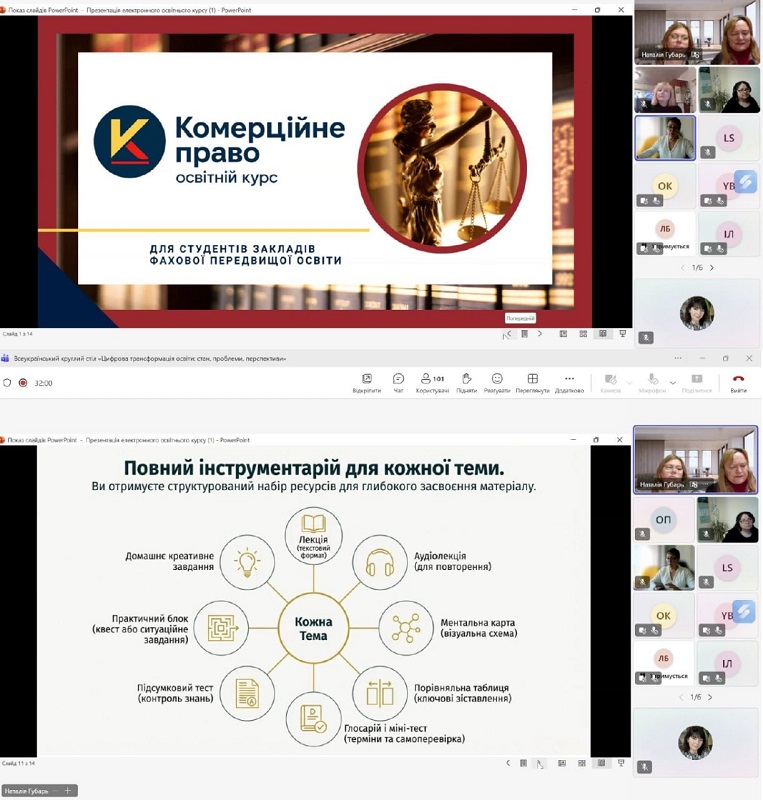 During the round table, participants – including Doctor of Economic Sciences, Professor Liudmyla Zavidna — discussed further steps in advancing the digital transformation of education. At the governmental level, priority areas include the creation of a unified digital educational environment integrated with e-governance systems and the introduction of state grants for innovative EdTech projects. At the institutional level, the focus is on implementing comprehensive digital ecosystems such as LMS platforms, electronic gradebooks, digital libraries, and online laboratories; developing hybrid learning courses incorporating VR/AR technologies, simulators, and interactive platforms; and fostering a “digital ecosystem” that connects schools, universities, and employers.