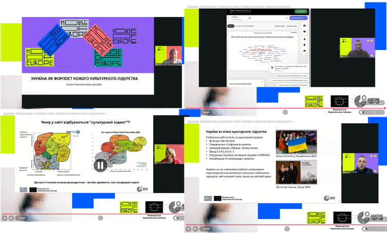 On February 11, 2026, the online discussion “Interspaces and Cultural Change: Ukraine as a Frontier of New Cultural Leadership” took place. The event was organized by House of Europe in partnership with Goethe-Institut Ukraine with the financial support of the European Union. It was held within the framework of the Cultural Transformation Lab initiative, aimed at supporting cultural managers, representatives of the creative industries, and civil society actors, particularly those working in the regions of Ukraine under the conditions of the full-scale war.