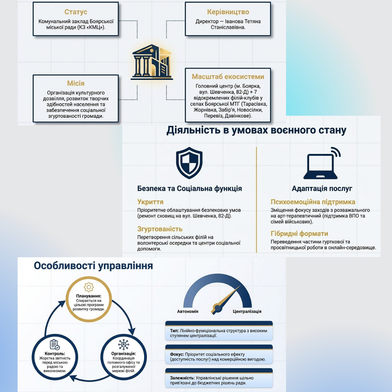 The internship base is the Municipal Institution “Cultural and Arts Center” of the Boyarka City Council – a modern cultural institution operating under dynamic societal challenges.