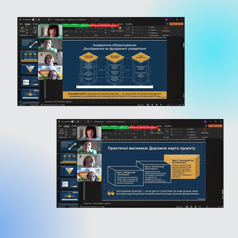 Окремий блок презентації було присвячено дослідженню цільової аудиторії як інструменту проєктного менеджменту та основи для залучення грантового фінансування. Продемонстровано підхід до трансформації емпіричних даних у практичні управлінські рішення та підготовку проєктних заявок до провідних донорських інституцій – Українського культурного фонду та House of Europe.