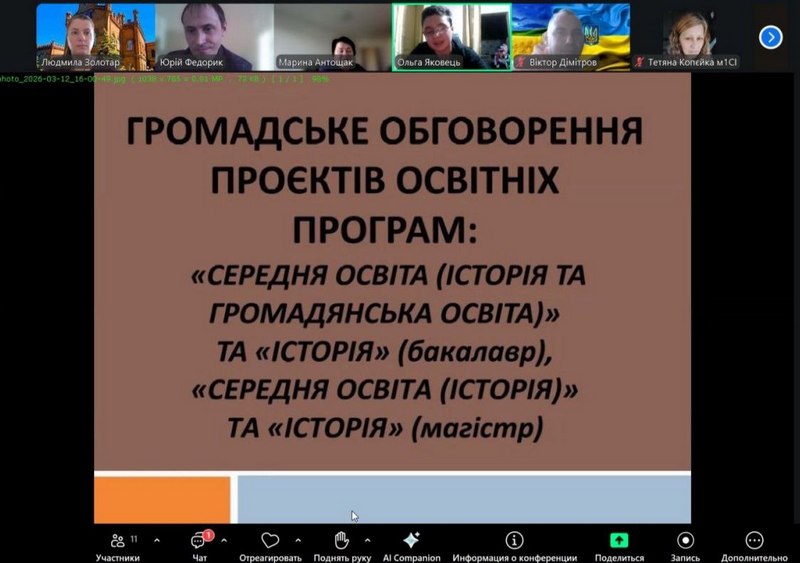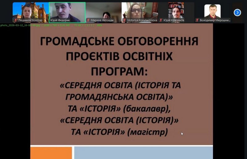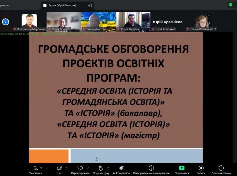 12 березня 2026 року кафедра історії та філософії провела громадські слухання проєктів освітніх програм «Середня освіта (Історія та громадянська освіта)», «Історія» – бакалаврського рівня та «Середня освіта (Історія)», «Історія» – магістерського рівня.