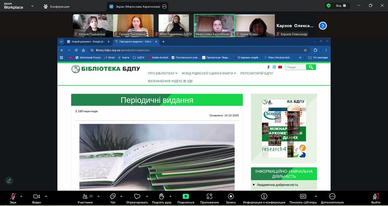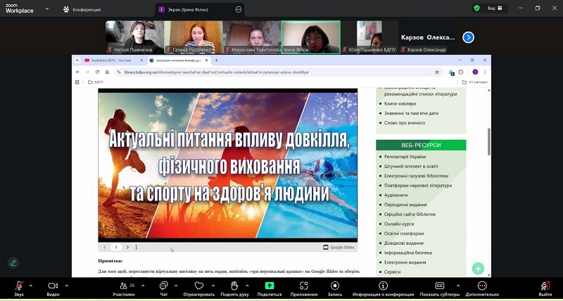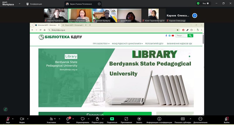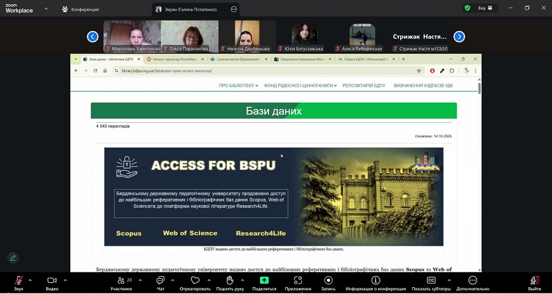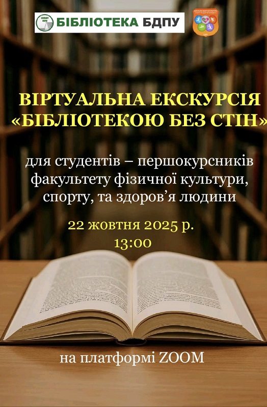 22.10.2025 фахівці бібліотеки Бердянського державного педагогічного університету провели віртуальну екскурсію для здобувачів вищої освіти факультету фізичної культури, спорту та здоров’я людини. На зустрічі були присутні студенти, які навчаються на освітньо-професійних програмах бакалаврського та магістерського рівнів кафедри фізичної культури, спорту та методики викладання, кафедри біології, здоров’я людини та фізичної реабілітації та кафедри хореографії та фітнесу.