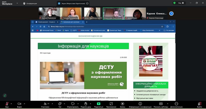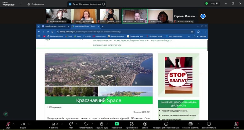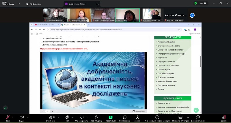 Провідна бібліотекарка Галина Потапенко познайомила здобувачів факультету зі структурою сайту та звернула увагу на ті його розділи, які можуть зацікавити студентів-першокурсників: інтелектуально-пізнавальні заходи, віртуальні виставки, онлайн-екскурсії, літературний гід, краєзнавчий Space, аудіокниги.