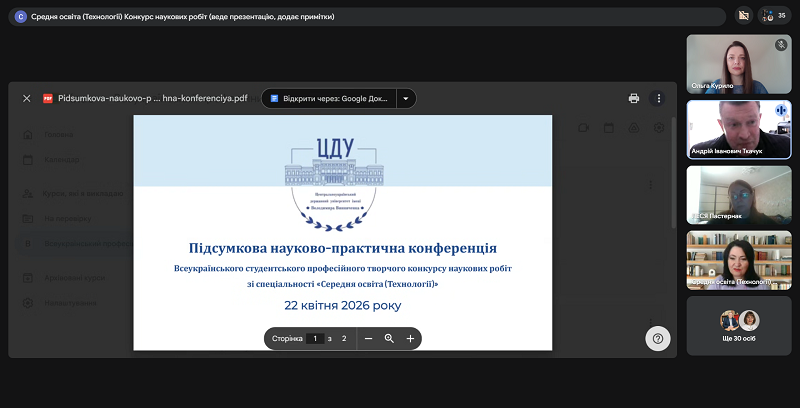 On April 22, 2026, the final scientific and practical conference of the All-Ukrainian Student Professional Creative Competition of Research Papers in the specialty “Secondary Education (Technologies)” was held. The event took place online, hosted by Volodymyr Vynnychenko Central Ukrainian State University, and brought together higher education students and scholars from different regions of Ukraine.