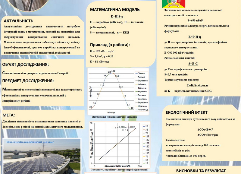 - «Математичне моделювання та економічна ефективність сонячних панелей: екологічний аспект для Запорізького регіону»,