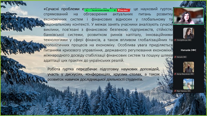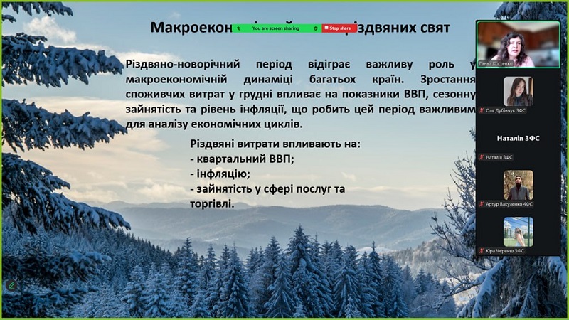 У межах діяльності наукового гуртка «Сучасні проблеми економіки та фінансів» 30 грудня 2025 року відбулося чергове засідання, присвячене дослідженню економічних і фінансових ефектів різдвяно-новорічного періоду. Обрана тематика викликала значний інтерес серед здобувачів освітньо-професійних програм «Фінанси, банківська справа та страхування» та «Економіка бізнесу», адже святковий період традиційно супроводжується змінами у фінансовій поведінці споживачів та інвесторів, що знаходить своє відображення як у мікро-, так і в макроекономічних процесах. Метою зустрічі було поглиблення теоретичних знань та формування цілісного уявлення про сезонні аномалії фінансових ринків і поведінкові аспекти прийняття економічних рішень.