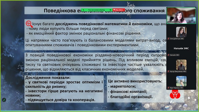 Під час засідання учасники ознайомилися з актуальними науковими підходами до вивчення сезонності на фінансових ринках. Зокрема, було детально розглянуто феномен Santa Claus Rally, який проявляється у підвищеній дохідності фондових ринків наприкінці року, а також The January Effect – січневий ефект як приклад календарної фінансової аномалії. Окрему увагу було приділено дослідженню економічної ефективності святкового дарування, відомому як The Deadweight Loss of Christmas, що дозволило проаналізувати святкові витрати з позицій мікроекономічної теорії та добробуту споживачів.