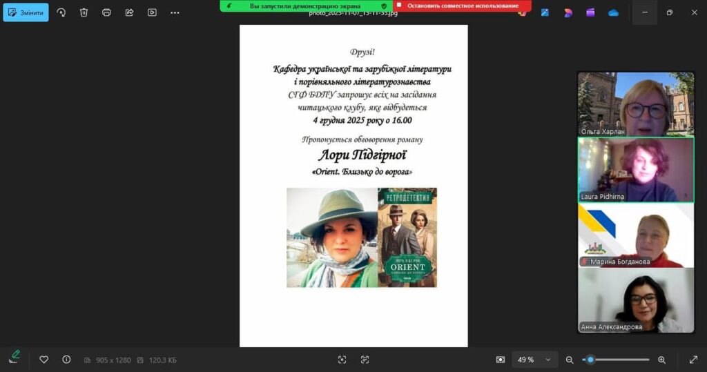 On December 4, 2025, in the cozy atmosphere of the Reading Club of Berdyansk State Pedagogical University, a warm and exceptionally engaging meeting took place with writer, historian, and Doctor of Philosophy Lora Pidgirna, the author of the novel “Orient. Close to the Enemy.”