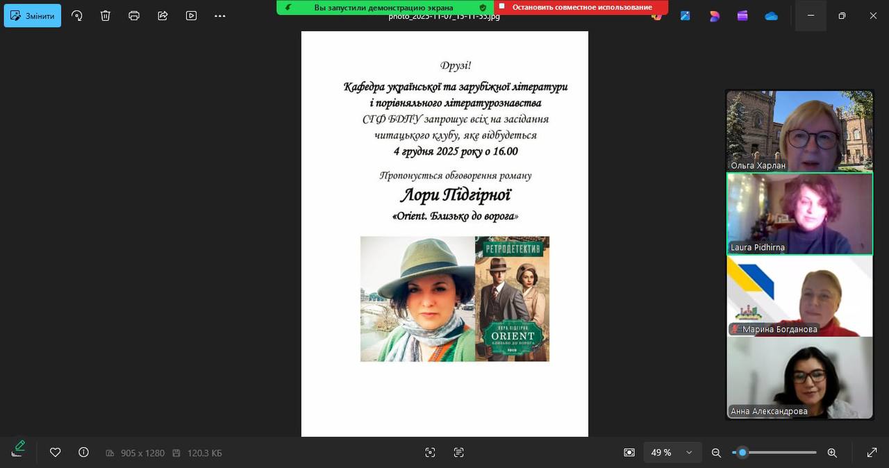 4 грудня 2025 року у затишній атмосфері читацького клубу Бердянського державного педагогічного університету відбулася тепла й надзвичайно цікава зустріч із письменницею, історикинею, докторкою філософії Лорою Підгірною – авторкою роману «Orient. Близько до ворога».